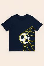 Kick off a winning look with the Goal Scorer Soccer Net T-Shirt! Designed for little football lovers, this trendy navy-blue t-shirt features a bold soccer ball and net graphic in white and yellow, capturing the excitement of scoring a goal. Made from soft and breathable cotton, it ensures all-day comfort, whether for playtime, sports practice, or casual outings. The round neckline and short sleeves provide a relaxed fit, making it an essential addition to any young athlete’s wardrobe.
