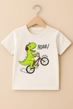 Let your little one roar in style with this adorable Dino Rider T-Shirt. Made with soft and breathable cotton, this white tee features a fun cartoon dinosaur riding a bicycle, wearing headphones, and shouting “ROAR!” — a design kids will love.