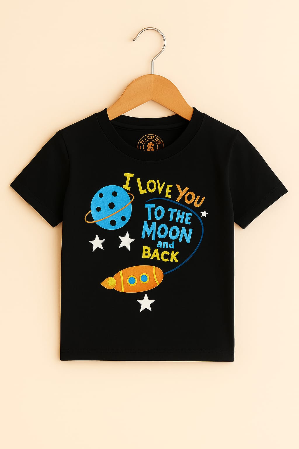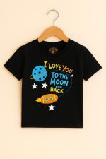 Let your little one’s imagination soar among the stars with the “I Love You to the Moon and Back” t-shirt. Made from premium-quality fabric, this black tee is as comfortable as it is stylish. Its colorful design showcases a captivating space scene complete with a bright yellow and orange rocket, a blue planet adorned with orange craters, and twinkling white stars. The message, “I Love You to the Moon and Back,” adds a touch of warmth and affection, making it perfect for everyday wear or a thoughtful gift. With durability to withstand all kinds of adventures, this t-shirt is designed for both fun and function, ensuring your kids shine like stars wherever they go.