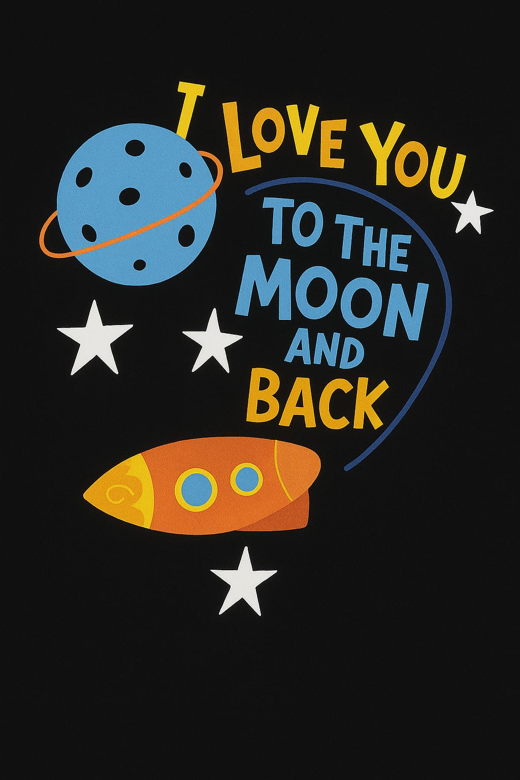 Express love that knows no bounds with this charming black t-shirt. Designed for young dreamers, it features a vibrant cosmic theme with a playful rocket, planet, and stars alongside the heartfelt message, “I Love You to the Moon and Back.”