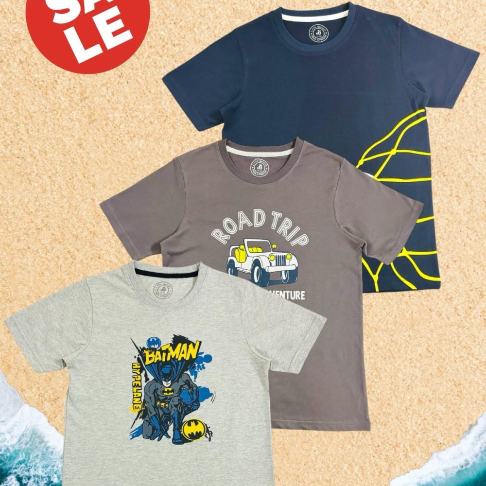 A vibrant trio of kids’ T-shirts featuring bold designs, including a Spider-Man-inspired red tee, perfect for young heroes-in-training. Comfortable, durable, and colorful—ideal for everyday adventures.